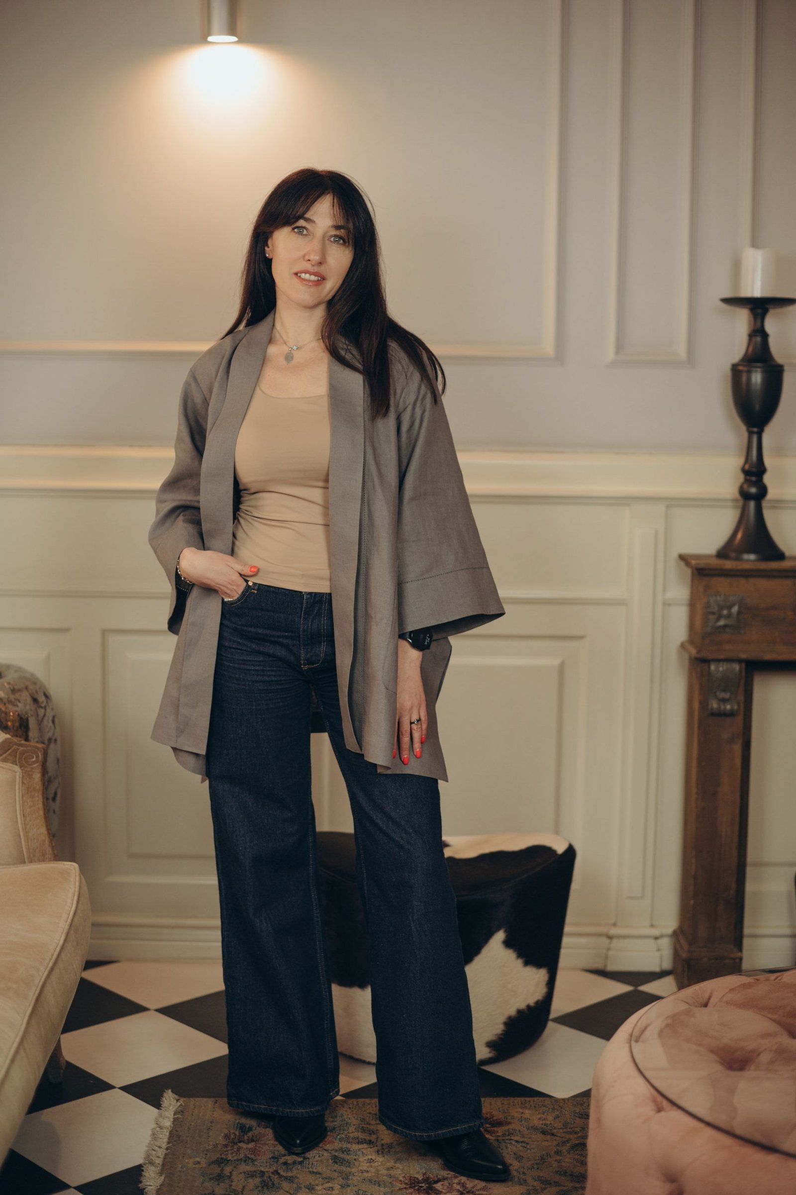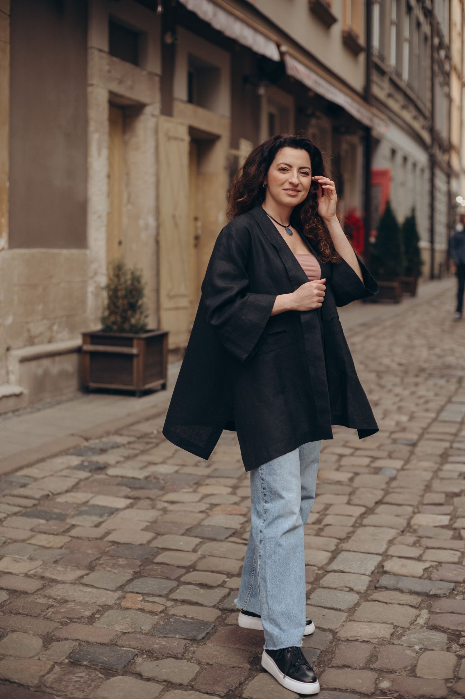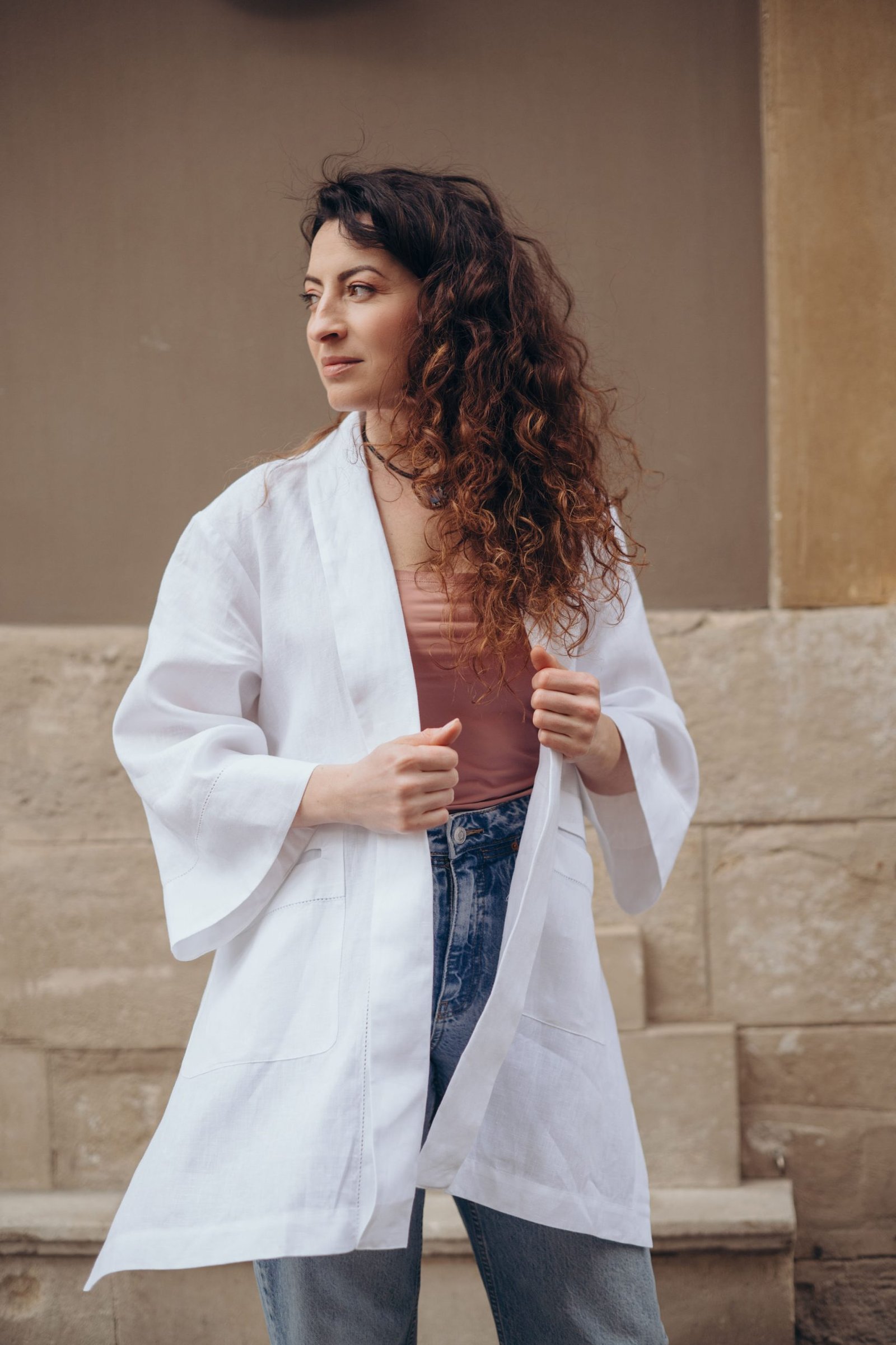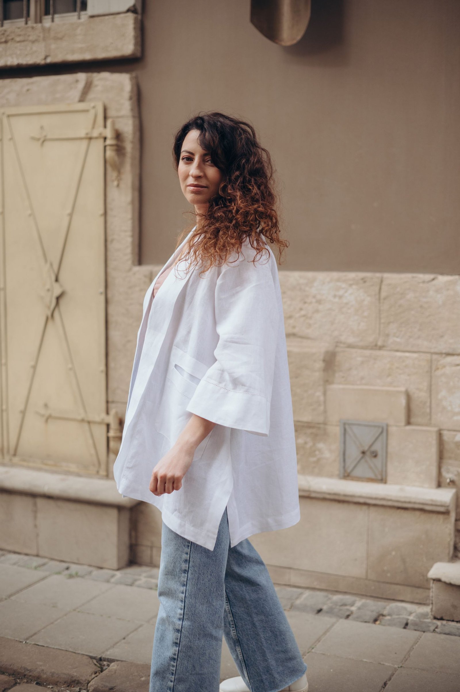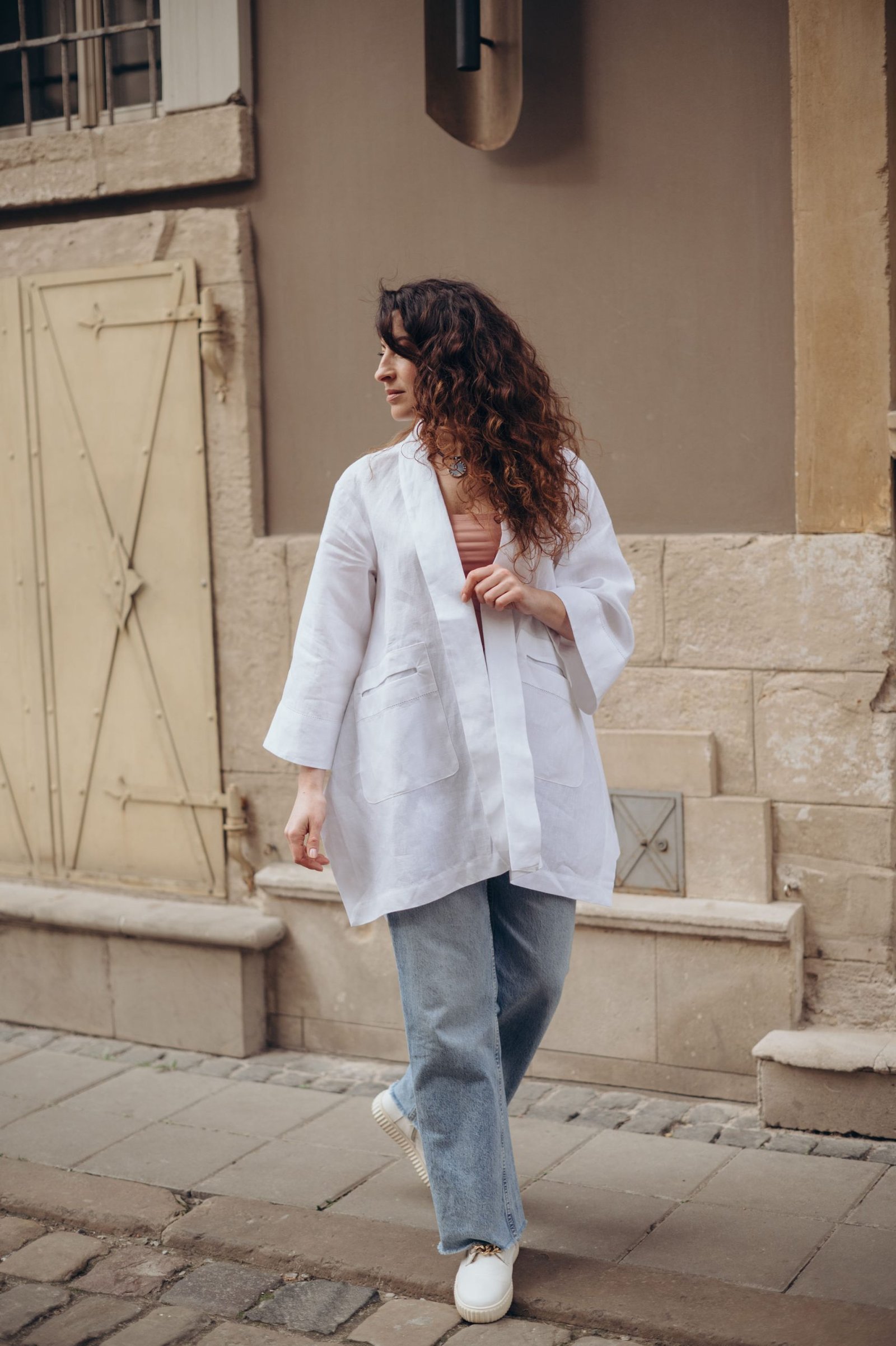 This 100% Italian linen Rozlitayka Blazer captivates with intricate patterning and flawless tailoring. A side slit allows easy movement and adds graceful flow to the silhouette. Decorative lace stitching along the front panels lends an artisanal touch of sophistication. The relaxed Rozlitayka Blazer cut blends comfort with feminine elegance, making it incredibly versatile. Wear it over a business suit, pair it with casual trousers, or layer it atop a dress for evening events. The natural linen ensures comfort and breathability throughout the year. This thoughtful design opens up endless stylish combinations for any occasion.