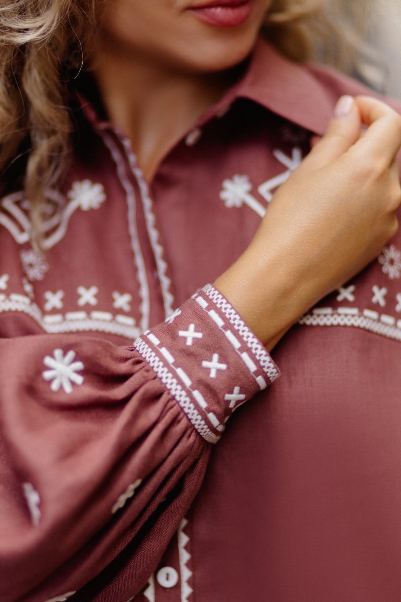 Designed for those who value both style and substance, the Runic Shirt features a free silhouette and rich detailing. The satin stitch embroidery, combined with a decorative band, adds depth and texture to its clean lines. Available in two striking versions—terracotta with white embroidery and white with blue embroidery—you can choose the color that best expresses your individuality.