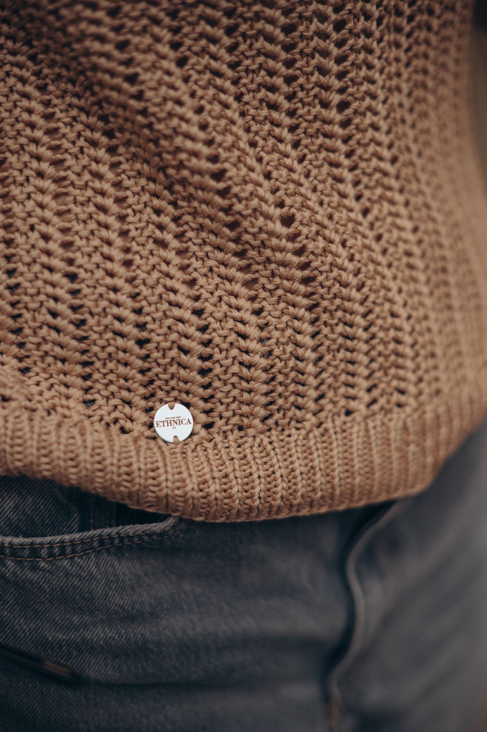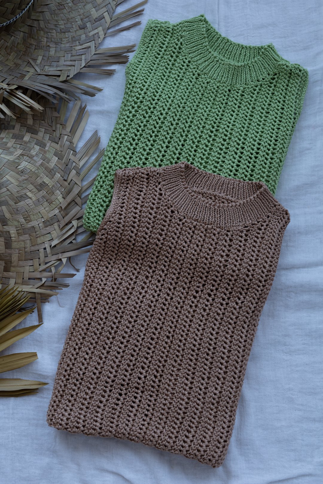 Crafted from a silky cotton-blend yarn, this lightweight hand-knitted top balances softness, style, and comfort. The airy mesh lace pattern feels gentle on the skin and breathes beautifully. It helps you stay cool even on warm days.